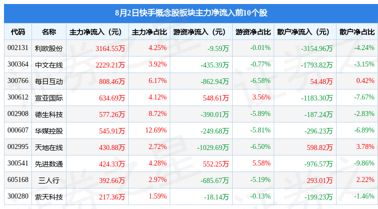 从资金流向上来看,当日快手概念股板块主力资金净流出5.73亿元,游资资金净流入87.76万元,散户资金净流入5.72亿元。快手概念股板块个股资金流向见下表: