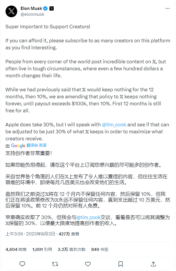 马斯克在推文中表示,在前 12 个月向所有内容创建者免费开放之后,后续不向年收入低于 10 万美元(IT之家备注:当前约 71.8 万元人民币)的创作者收取任何费用。