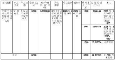 公司在中国工商银行股份有限公司天台平桥支行办理《中国工商银行股份有限公司单位定期凭证》,以部分闲置募集资金人民币3,500万元购买了定期存款,具体内容详见公司2023年4月15日于上海证券交易所网站(www.sse.com.cn)披露的公告《浙江大自然户外用品股份有限公司关于使用部分闲置募集资金进行现金管理的进展公告》(公告编号:2023-009)。公司分别于2023年5月26日提前赎回部分上述理财产品,已收回本金1,000万元,获得理财收益3.656146万元;于2023年7月31日再次提前赎回部分上述理财产品,已收回本金500万元,获得理财收益4.555479万元。公司于2023年8月2日再次提前赎回部分上述理财产品,收回本金1,500万元,获得理财收益13.917354万元。此次赎回后,此笔定期存款尚余500万元未赎回。
