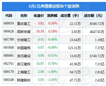 8月2日房屋建设板块较上一交易日下跌0.55%,陕建股份领跌。当日上证指数报收于3261.69,下跌0.89%。深证成指报收于11104.16,下跌0.35%。房屋建设板块个股涨跌见下表: