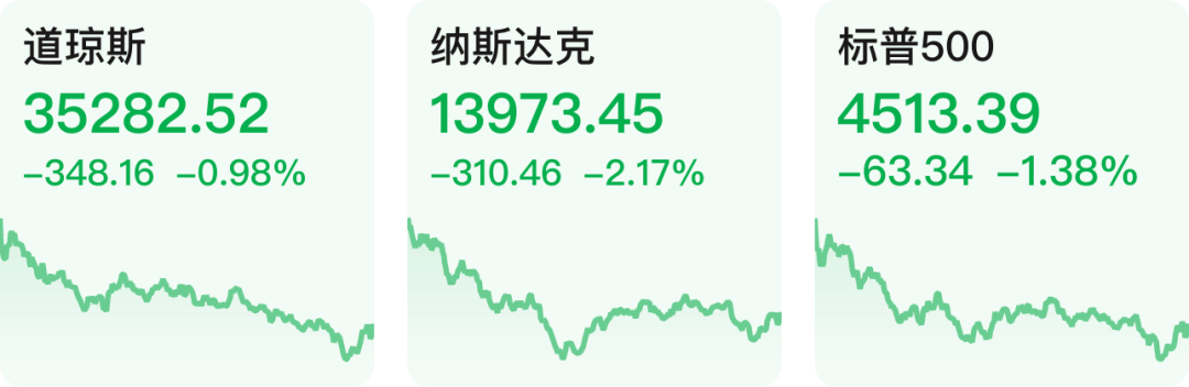 美股三大指数集体收跌,道指跌0.98%,纳指跌2.17%,标普500指数跌1.38%,热门科技股普遍下跌,AMD跌逾7%,英伟达跌超4%,英特尔跌近4%,特斯拉、谷歌、亚马逊、微软跌超2%。热门中概股普跌,纳斯达克中国金龙指数跌4.21%。