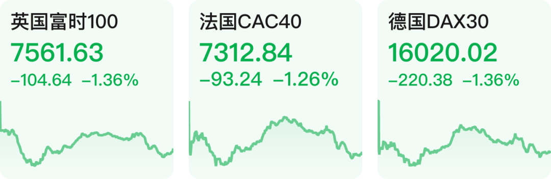 欧洲三大指数全部下跌。截至收盘,英国富时100指数跌1.36%,法国CAC40指数跌1.26%,德国DAX30指数跌1.36%。