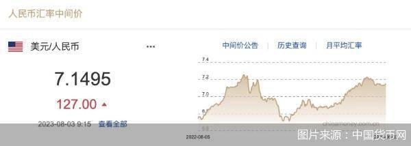 北京商报讯(记者 廖蒙)8月3日,人民银行授权中国外汇交易中心公布,2023年8月3日银行间外汇市场人民币汇率中间价为:1美元对人民币7.1495元,前一交易日中间价报7.1368元,单日调降127基点。人民币中间价连续两个交易日走贬。