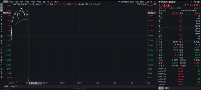 截至10:00,生物医药ETF华安(159508)盘中持续拉升,已涨1.27%,换手率达到6.72%,市场交投活跃,备受资金关注。