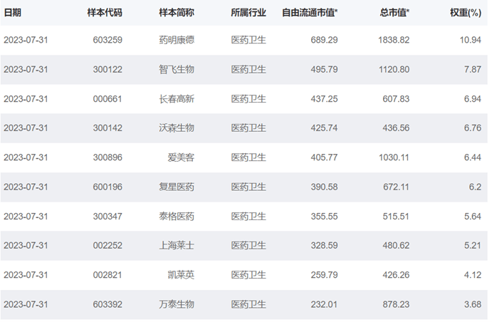 数据显示,截至2023年7月31日,该指数前十大权重股包括药明康德、智飞生物、长春高新、沃森生物、爱美客等,前十大之和为63.80%。(数据来源:国证指数公司,指数成份股不代表个股推荐)