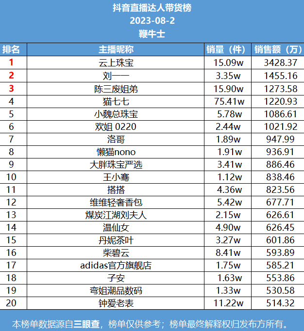 8月2日,抖音直播达人带货榜一是云上珠宝,销售额3428.37万;榜二刘一一,销售额1455.16万;榜三陈三废姐弟,销售额1273.58万。
