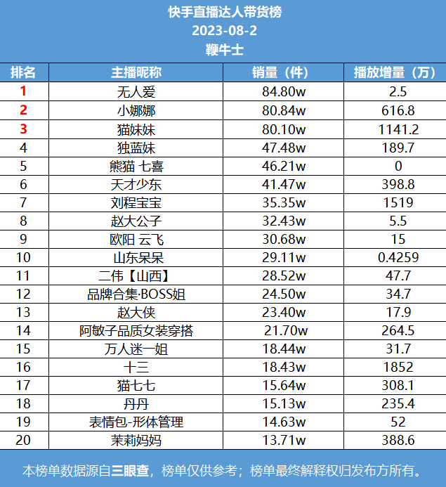 快手榜一无人爱,销量84.8万件;榜二小娜娜,销量80.84万件;榜三猫妹妹,销量80.1万件。
