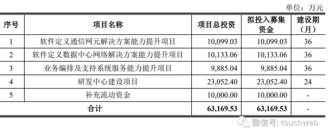 赛特斯曾计划募资6.3亿元,其中,1亿元用于软件定义通信网元解决方案能力提升项目,1亿元用于软件定义数据中心网络解决方案能力提升项目,9885万元用于业务编排及支持系统服务能力提升项目,2.3亿元用于研发中心建设项目,1亿元用于补充流动资金。