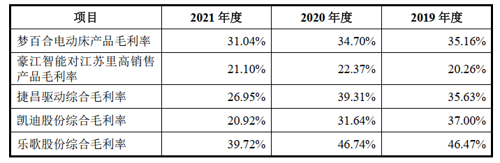 事实上,原本豪江智能对江苏里高的毛利率已经低于其综合毛利率3个百分点以上。具体来看,2021年豪江智能对江苏里高销售产品毛利率为21.1%,而其当期综合毛利率为24.42%。