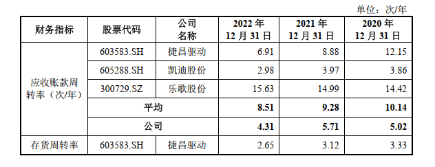 但也需要注意的是,由于销售模式及回款方式不同,豪江智能的应收账款周转率过低现象由来已久。2022年豪江智能的应收账款周转率为4.31次/年,与2022年相比降低1.4次/年,与行业平均水平8.51次/年相比,周转率相差近50%。