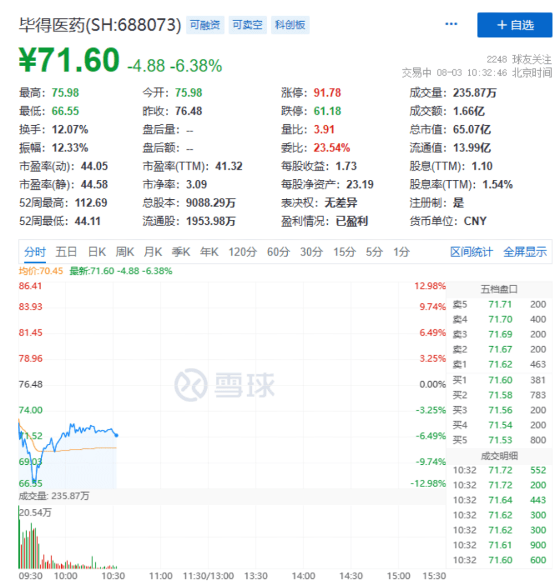 不过,在一众CRO概念股欣欣向荣之际,前期大涨的毕得医药上午股价跳水,盘中跌幅一度达到13%。截至发稿,跌幅收窄至6%。