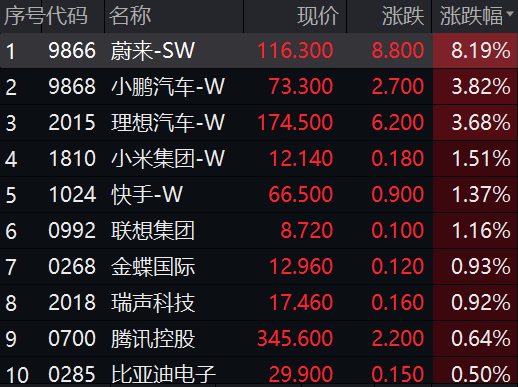 港股市场上,早间恒指低开0.58%,恒生科技微跌0.13%。截至发稿,恒生科技强势翻红,蔚来、理想汽车、小鹏汽车领涨。恒大物业复牌暴跌50%,领跌港股市场。