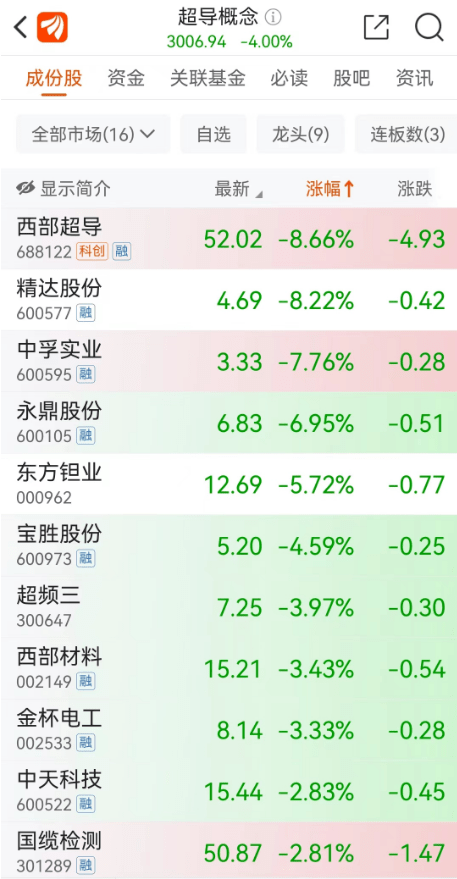 8月3日早间,近期炙手可热的超导概念股集体出现大幅回调,板块跌超4%。