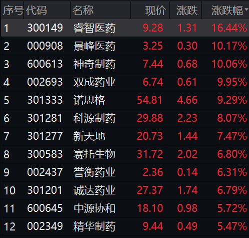 早间睿智医药一度拉出20CM涨停,景峰医药、神奇医药、双成药业涨停。诺思格、新天地、赛托生物、誉衡药业等涨超6%。