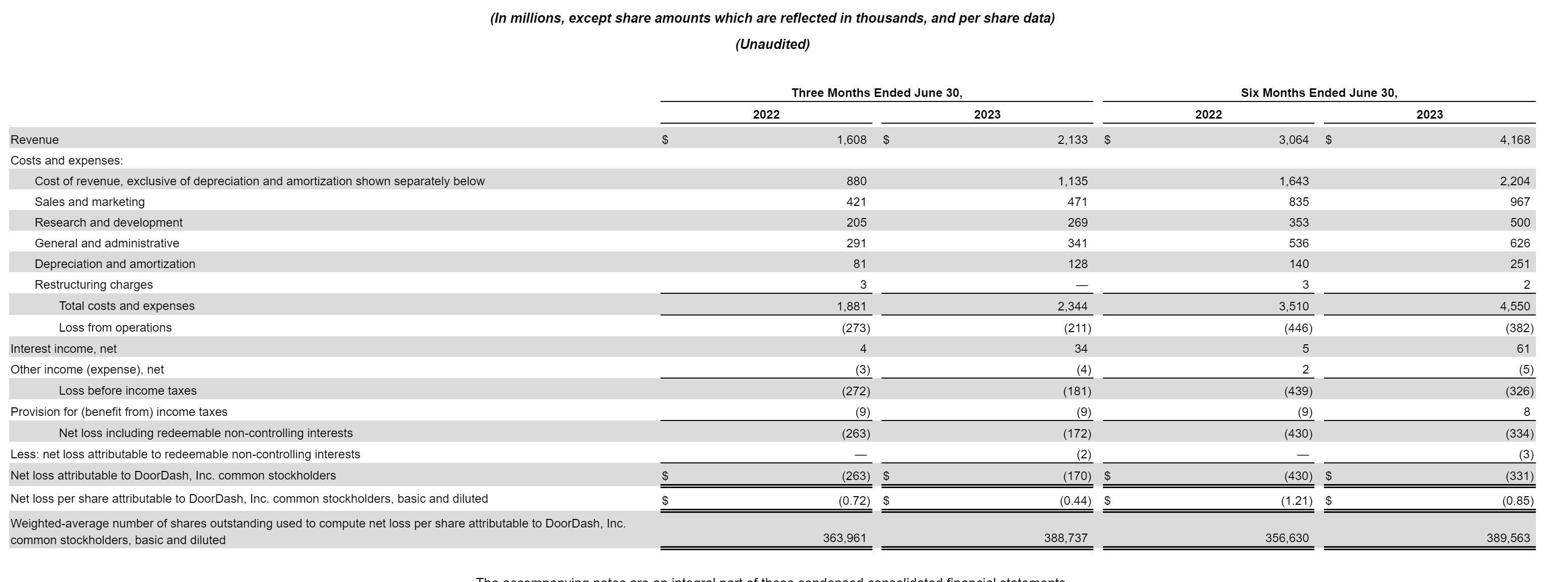 DoorDash在2023年第二季度归属于股东的净亏损为1.7亿美元,上年同期归属于股东的净亏损为2.63亿美元。
