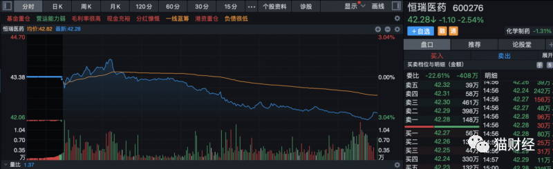 当日,恒瑞医药股价下跌2.54%,收于42.28元/股,总成交金额为42.03亿元。