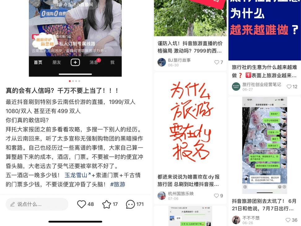 除此之外,抖音酒旅套餐的服务品质也亟待加强。壹览商业发现,在小红书等社媒平台,输入“抖音旅行团”等关键词,有众多相关的避雷帖。避雷理由大多为“直播间导购对产品所述与实际情况不符”、“酒旅产品页面描述与实际情况不符”、“有额外付费项目”等。目前为止,抖音依然缺乏深度且高质量的旅游服务。直播间的明星达人也往往使用统一的成交话术,并没有对产品有更深入的理解。