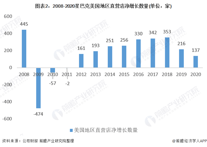 2012-2018星巴克美国地区直营店数量呈上升趋势,2019-2020年有所下降。据星巴克2020年年报,2020年美国地区直营店净增长数量137家,总数达到6387家。