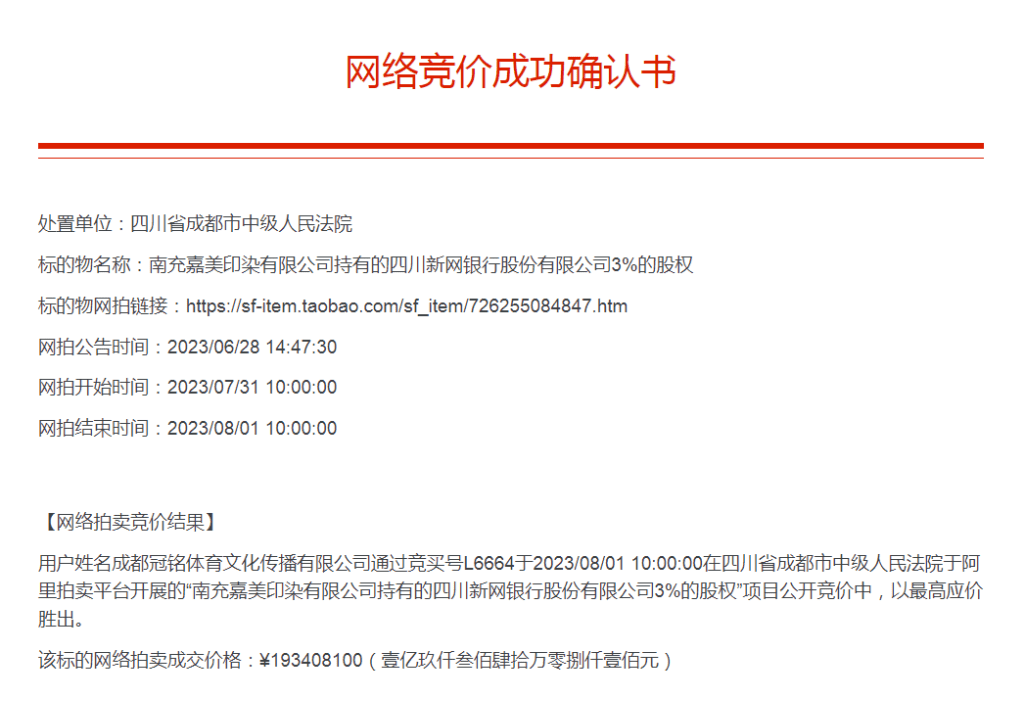阿里拍卖平台信息显示,成都冠铭体育文化传播有限公司(以下简称“冠铭体育”)公开竞价中,以最高应价1.934亿元胜出,竞得新网银行9000万股。