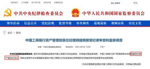 8月2日15点,中央纪委国 家监委网站通告,中国工商银行资产管理部原总经理顾建纲接受纪律审查和监察调查。 通告称,据中央纪委国家监委驻中国工商银行纪检监察组、甘肃省纪委监委消息: 中国工商银行资产管理部原总经理顾建纲涉嫌严重违纪违法,目前正接受中央纪委国家监委驻中国工商银行纪检监察组纪律审查和甘肃省定西市监察委员会监察调查。
