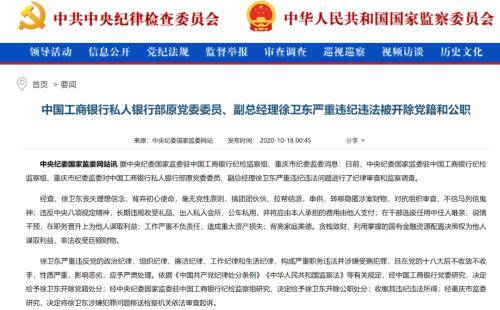 也是在2020年10月,中央纪委国家监委网站通告,中国工商银行私人银行部原党委委员、副总经理徐卫东严重违纪违法被开除党籍和公职。