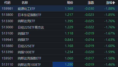 下跌方面,纳斯达克ETF和日经225ETF都跌了1.76%。