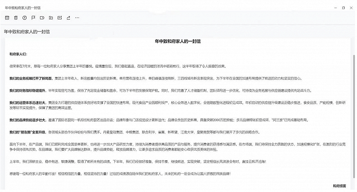 这封信中还提到,“同时,集团财务指标稳健提升,半年实现扭亏为盈,保持了充足现金储备和盈余,可为下半年的发展保驾护航。同时,产品端已完成全国菜单更新,下半年将加速规模化扩张。”