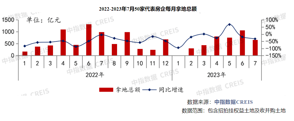 在房地产市场深度调整的背景下,头部房企拿地的热情仍然在局部持续。中指研究院最新数据显示,2023年1-7月,TOP100房企拿地总额为6946亿元,同比下降13.4%,降幅较上月扩大3.2个百分点。“今年‘小阳春’结束后,3-7月新房成交规模环比持续回落,直接影响房企拿地信心,导致土拍热度连月下降。“