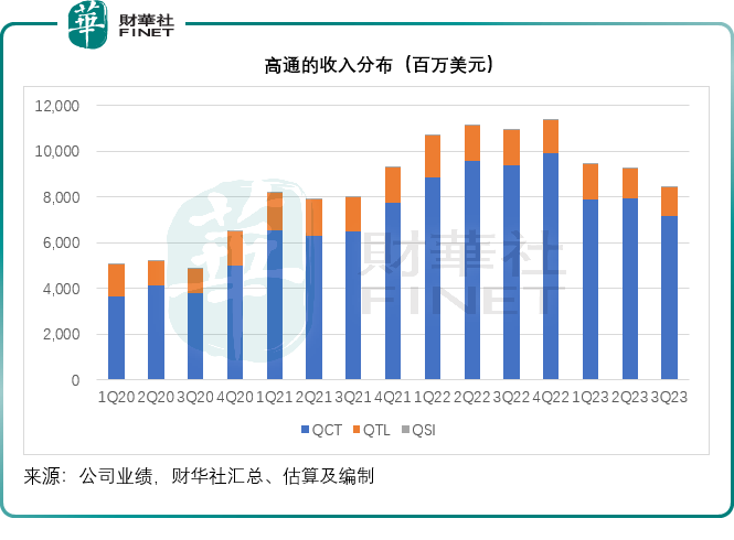 2023年6月财季,QCT(半导体业务分部)贡献收入71.74亿美元,按年下滑23.50%,占高通总收入的84.89%,分部税前利润率为24.31%,税前利润按年下滑41.79%,至17.44亿美元。