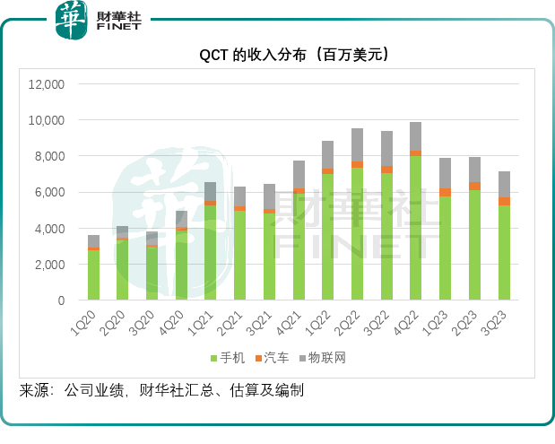 QCT(半导体业务)又分为三大细分界别,分别为手机、汽车和物联网。QCT整体收入下滑是受到了手机收入下滑25.43%的拖累,2023年6月财季,手机QCT业务收入按年下降25.43%,至52.55亿美元。