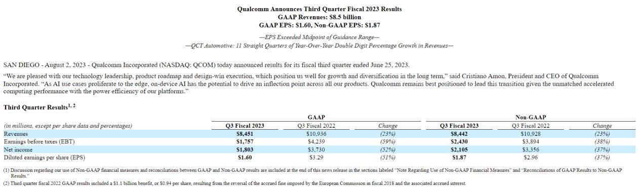 【环球网科技综合报道】8月3日消息,根据高通公司发布的截至2023年6月25日的第三财季业绩报告,高通第三季度营收为 84.51 亿美元,相比去年同期的109.36亿美元下滑 23%。净利润为 18.03 亿美元,同比下滑 52%。