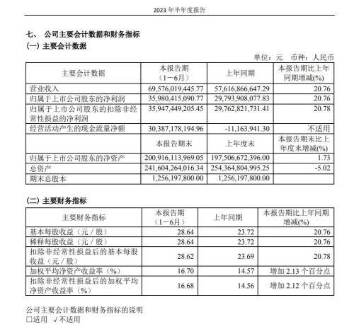 2日晚间,贵州茅台披露2023年半年度报告显示,上半年实现营业收入695.76亿元,同比增长20.76%;归属于上市公司股东的净利润359.80亿元,同比增长20.76%;基本每股收益28.64元,同比增长20.76%。