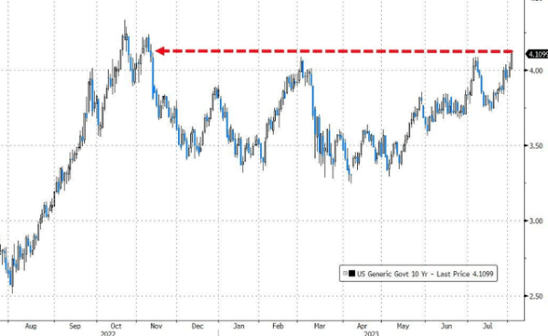 即将到来的“美债海啸”考验市场对美债的需求,十年期美债收益率飙升至2022年11月以来的最高水平。