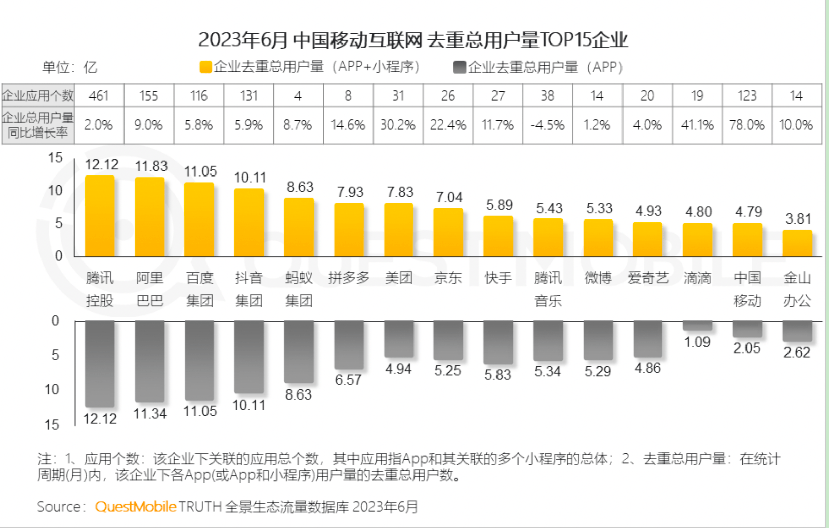 紧随其后的,蚂蚁集团、拼多多、美团、京东、快手、腾讯音乐、微博去重用户总量分别为8.63亿、7.93亿、7.83亿、7.04亿、5.89亿、5.43亿、5.33亿,同比增长8.7%、14.6%、30.2%、22.4%、11.7%、-4.5%、1.2%。也就是说,总体上看,经过2023年上半年的快速增长,去重用户突破5亿规模的移动互联网玩家已经达到11家。