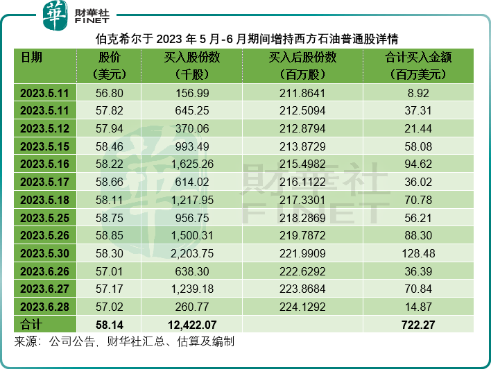 其后,伯克希尔在5月到6月期间接连增持西方石油,财华社汇总如下: