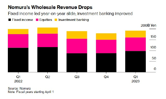 负责投资银行和交易业务的批发业务营收下降了4%,全球市场业务下降了9%。固定收益营收下降14%,虽然没有像高盛等美国同行的类似交易业务那么糟糕,但与包括大和证券和瑞穗证券在内的国内竞争对手的增长形成了鲜明对比。