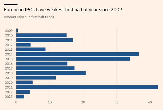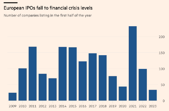 今年上半年,仅有34家公司在欧洲上市,创2009年以来的最低记录——当时正在经历全球金融危机造成的余波。