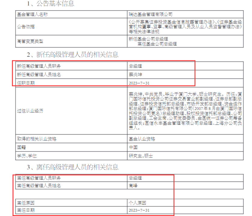 8月2日,瑞达基金发布高级管理人员变更公告,高峰因个人原因离任,蔡炎坤接棒总经理,任职日期7月31日。