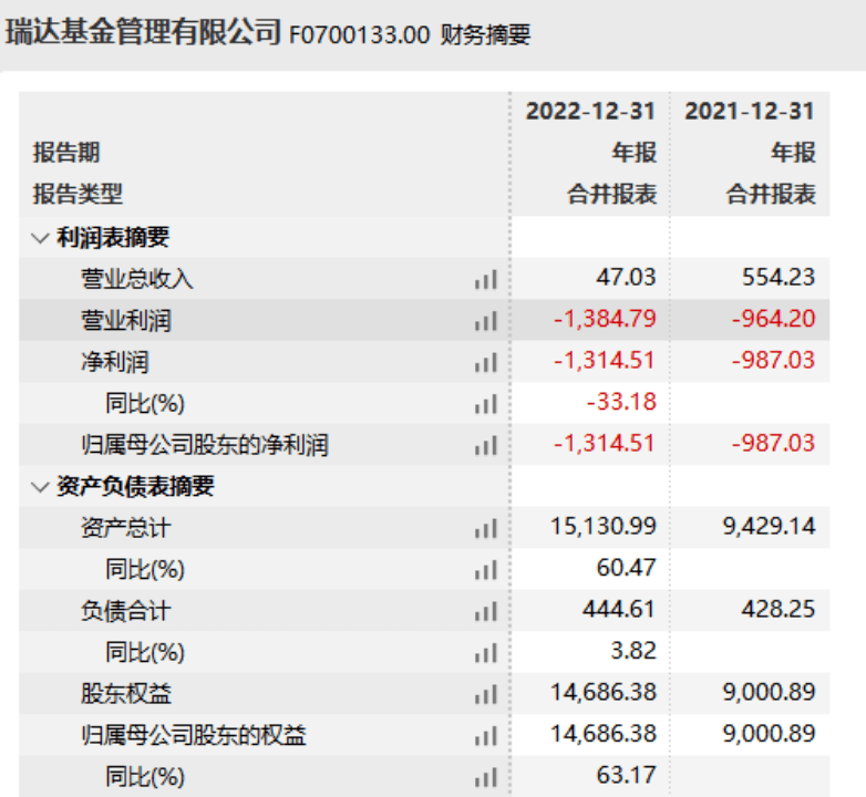 此前,瑞达期货2022年报显示,2022年瑞达基金实现营业收入约47.03万元,净利润为-1314万元。