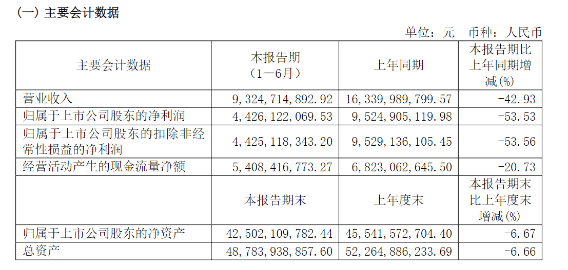 半年报显示,公司2023年上半年实现营业收入93.24亿元,同比下滑42.93%;实现归母净利润44.26亿元,同比下滑53.53%;实现扣非归母净利润44.25亿元,同比下滑53.56%。