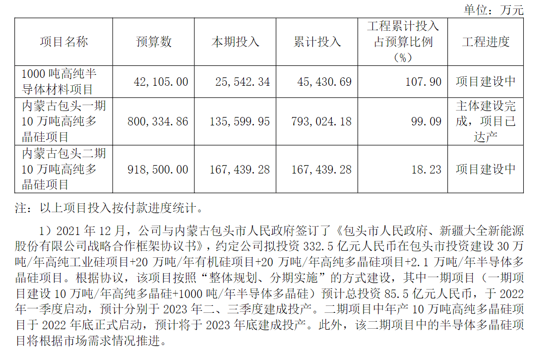 2021年12月,大全能源与内蒙古包头市人民政府签订《包头市人民政府、新疆大全新能源股份有限公司战略合作框架协议书》,约定公司拟投资332.5亿元在包头市建设30万吨/年高纯工业硅项目、20万吨/年有机硅项目、20万吨/年高纯多晶硅项目和2.1万吨半导体多晶硅项目。