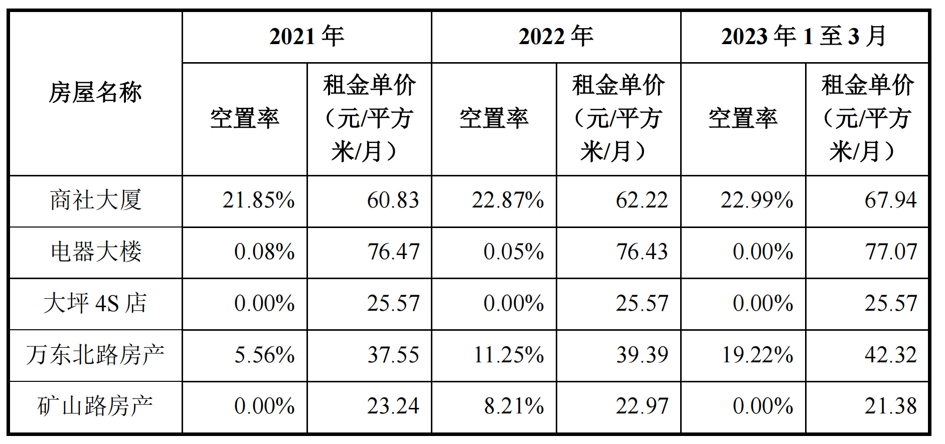 而拟吸收合并重庆商社或也承袭了张文中的“激进”。据钛媒体APP了解,重庆商社旗下的主要资产包括商社大厦、电器大楼、大坪4S店、万东北路房产、矿山路房产等。据公告,2021年、2022年、2023年一季度商社大厦空置率分别为21.85%、22.87%和22.99%,万东北路房产空置率分别为5.56%、11.25%和19.22%。