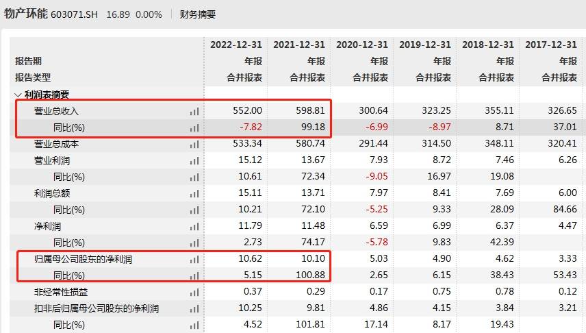 财务数据显示,上市当年,物产环能业绩大爆发,实现营业收入598.81亿元,同比增加99.18%;归属于上市公司股东的净利润(下称“净利润”)为10.10亿元,同比增加100.88%。2022年,公司营业收入同比降7.82%,净利润同比增5.15%。