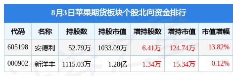 北向资金方面,当日苹果期货板块北向资金持股市值为1.38亿元,增持140.08万元。其中增持最多的是安德利,增持了124.74万元。苹果期货板块北向资金持股变动明细见下表: