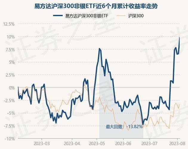 8月3日,易方达沪深300非银ETF最新单位净值为0.7196元,累计净值为2.1588元,较前一交易日上涨2.92%。历史数据显示该基金近1个月上涨13.02%,近3个月上涨8.1%,近6个月上涨9.68%,近1年上涨26.42%。该基金近6个月的累计收益率走势如下图: