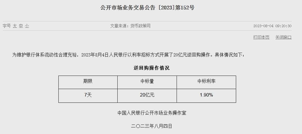 中新经纬8月4日电 据央行网站4日消息,为维护银行体系流动性合理充裕,2023年8月4日人民银行以利率招标方式开展20亿元逆回购操作。