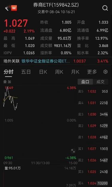 金融界8月4日消息,券商股集体高开,国联证券一字涨停,首创证券、东方财富、东吴证券、国盛金控、国元证券、信达证券等集体高开。ETF方面,券商ETF(159842)交易活跃大涨2.19%,当前成交额近亿元。
