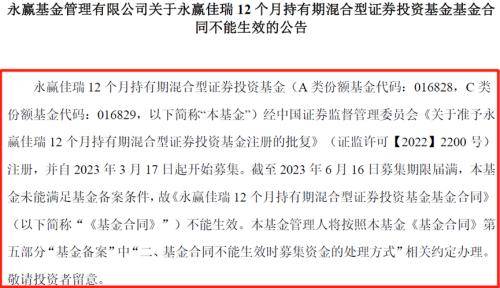 截至2023年6月16日募集期限届满,永赢佳瑞12个月持有期混合未能满足基金备案条件,故《永赢佳瑞12个月持有期混合型证券投资基金基金合同》不能生效。