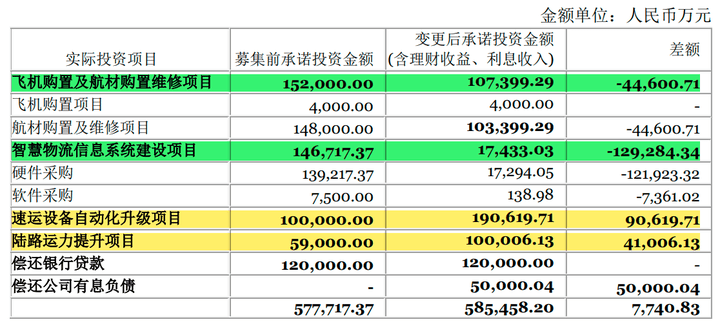 其中,缩减金额最多的智慧物流信息系统建设项目和飞机购置及航材购置维修项目,均称为提高募资使用效率,在保持项目总投资金额不变的情况,减少了募资投入比例,减少部分改为使用自有资金投入。