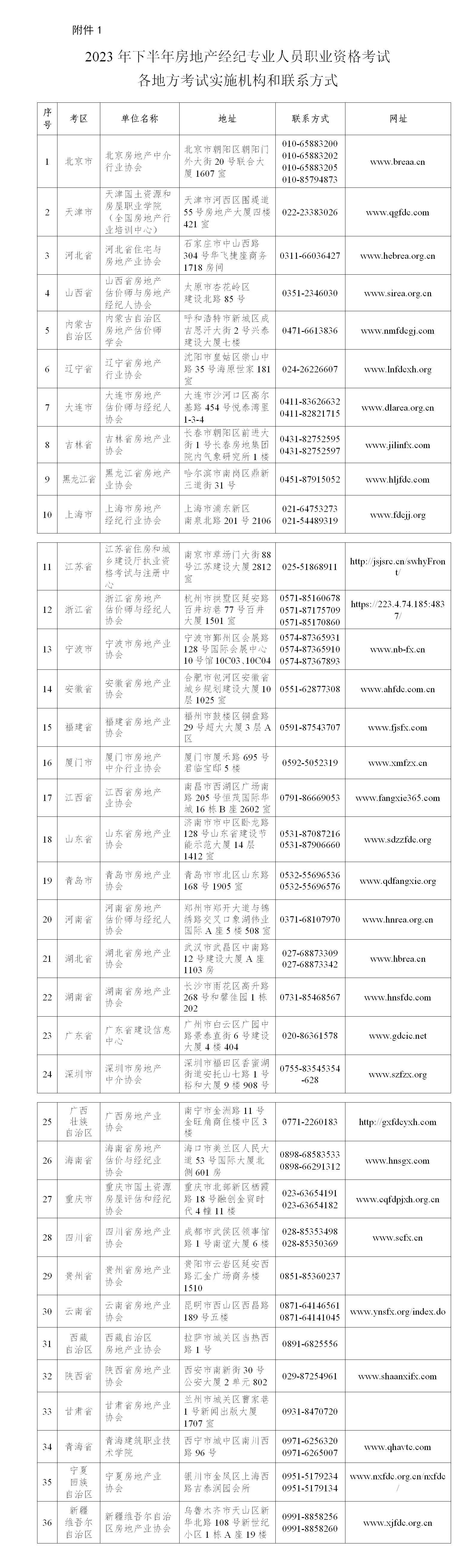 2023年下半年房地产经纪专业人员职业资格考试在全国31个省(自治区、直辖市)和5个计划单列市同时举行。各个考区的地方考试实施机构和联系方式,见附件1。